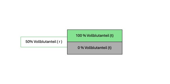 Nehmen wir nun zur vereinfachten Darstellung an, dass eine Halbblutstute mit genau 50% mit einem Halbbluthengst verpaart wird. Beide Elterntiere entstammen der hypothetischen Anpaarung aus einem Pferd mit 0 Prozent Vollblutanteil und einem Pferd mit 100% Vollblutanteil. Zur Berechnung wird, mangels besserer Alternativen, zugrundegelegt, dass das Fohlen von jedem seiner Elternteile die Hälfte des Vollblutanteils erhält (also 25 Prozent Vollblutgenetik + 25 Prozent Warmblutgenetik), demnach wird hier als rechnerischer Vollblutanteil, addiert aus den beiden Vierteln der Eltern, insgesamt wieder ein Vollblutanteil von 50 Prozent ausgewiesen. Ob das Fohlen aber im Zuge der weitgehend zufälligen Allokation der entsprechenden Genetik tatsächlich die Hälfte des Vollblutanteils seiner Mutter oder seines Vaters erhalten hat, ist ohne aufwendige genetische Untersuchung nicht zu sagen. Meistens wird dies nicht der Fall sein und es kommt zu erheblichen Abweichungen. Das Fohlen könnte tatsächlich auch nur 35 Prozent Vollblutanteil oder gar 65 Prozent Vollblutanteil haben. Dies ist auch der Grund für die erheblichen Unterschiede, die zwischen mehreren Vollgeschwistern bestehen können – man werfe nur einen Blick auf die eigene Familie.